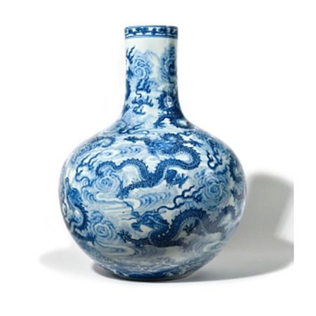 The vase has a spherical body and a long cylindrical neck. It measures 21 x 16 inches and is decorated with dragons and clouds, according to the listing. Tianqiuping vases are also known as “celestial sphere” vases because of their shape.
