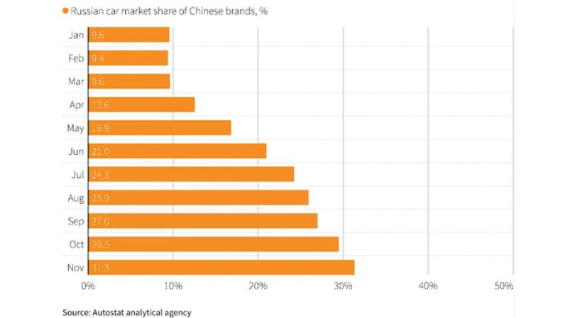 However, according to data from the Russian analytical agency Autostat collected by Reuters, sales of Chinese brand cars increased by 90%, and the market share of brands such as Haval, Chery and Geely went from a modest 9.6% to 31.3% in just one year.