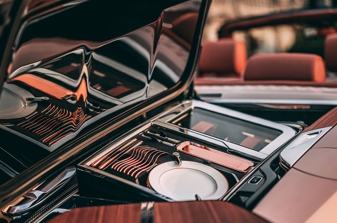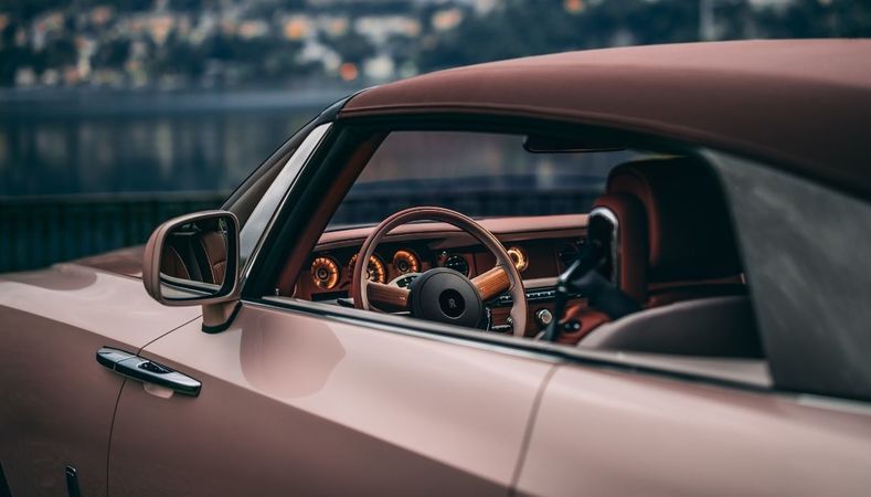 The client presented Rolls-Royce Coachbuild designers with a selection of four pearl shells, personally selected from their exclusive collection for their unique colors and detailing. The veneers were the inspiration for the exterior colour, one of the most complex veneers ever produced by Rolls-Royce. Boat Tail technical fiber lintels feature rose gold woven thread.