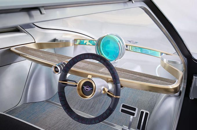 Unlike the Rolls Royce concept without a steering wheel, the new Mini will have a small steering wheel for manual use; but this steering wheel will fold out of your way to free up knee room in automatic driving. So you’ll be driving a car that’s as compact as the first Mini, measuring just 3 meters and 14 inches.